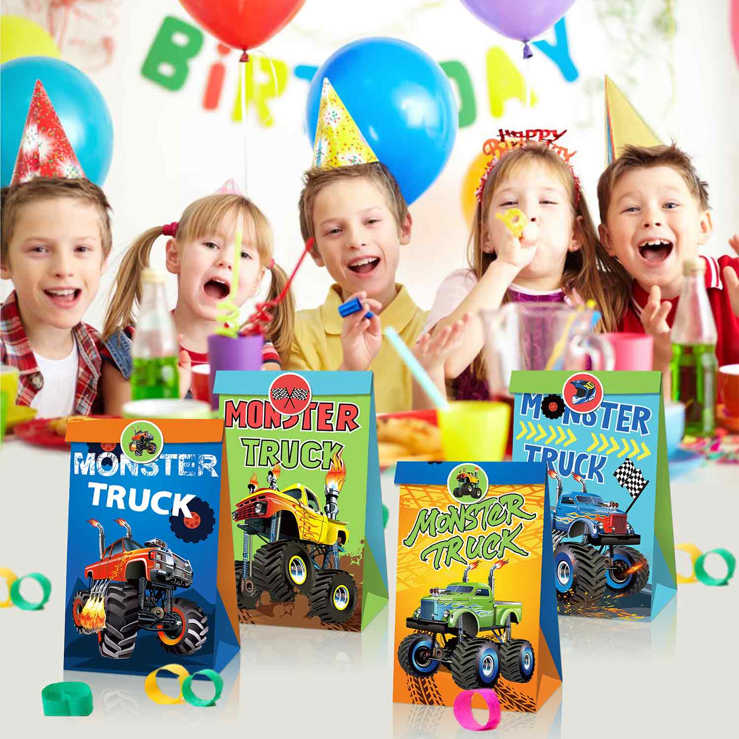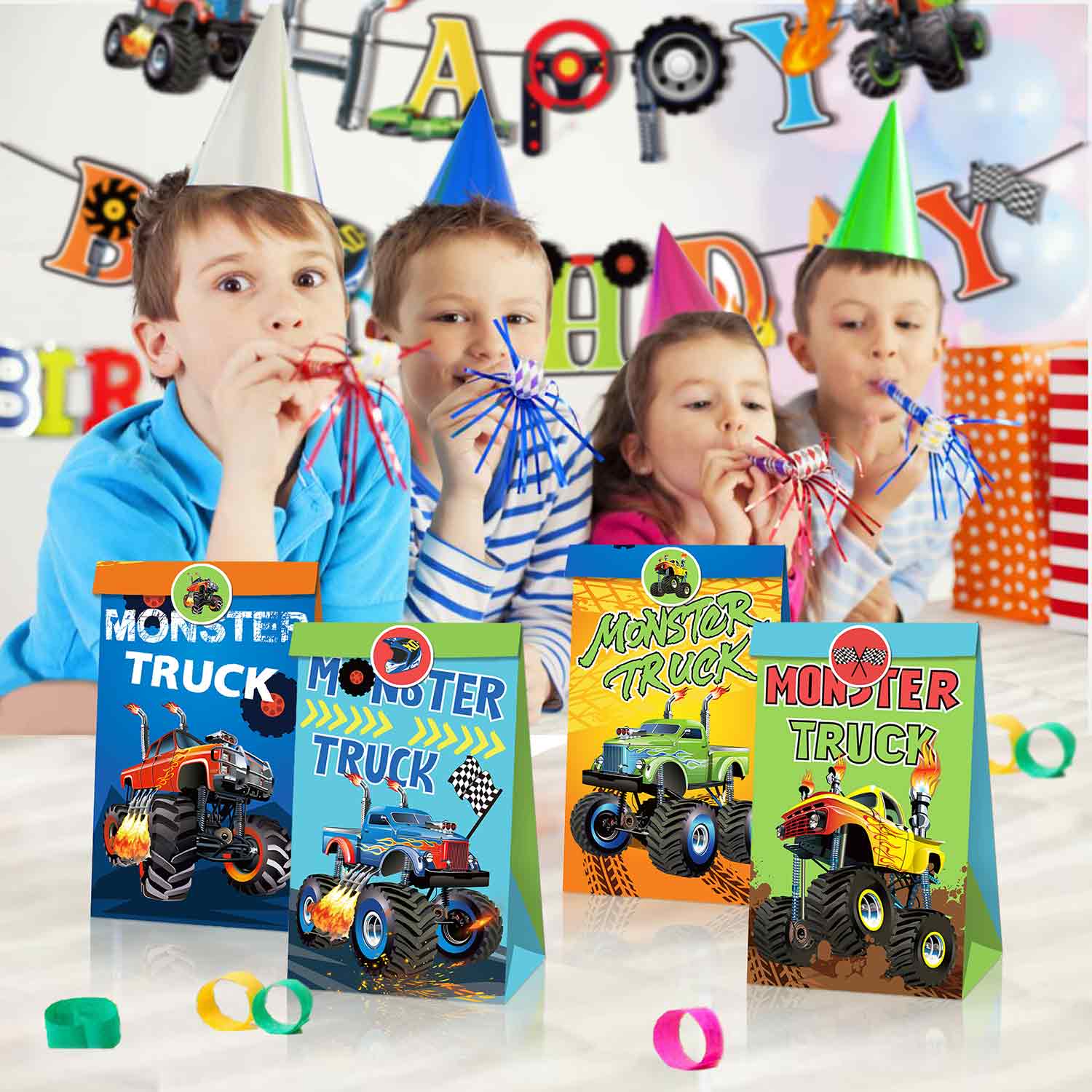 捷伦12个赛车主题儿童糖果纸袋-赛车礼品袋、礼品袋、怪物卡车主题纸袋、购物袋、牛皮纸袋