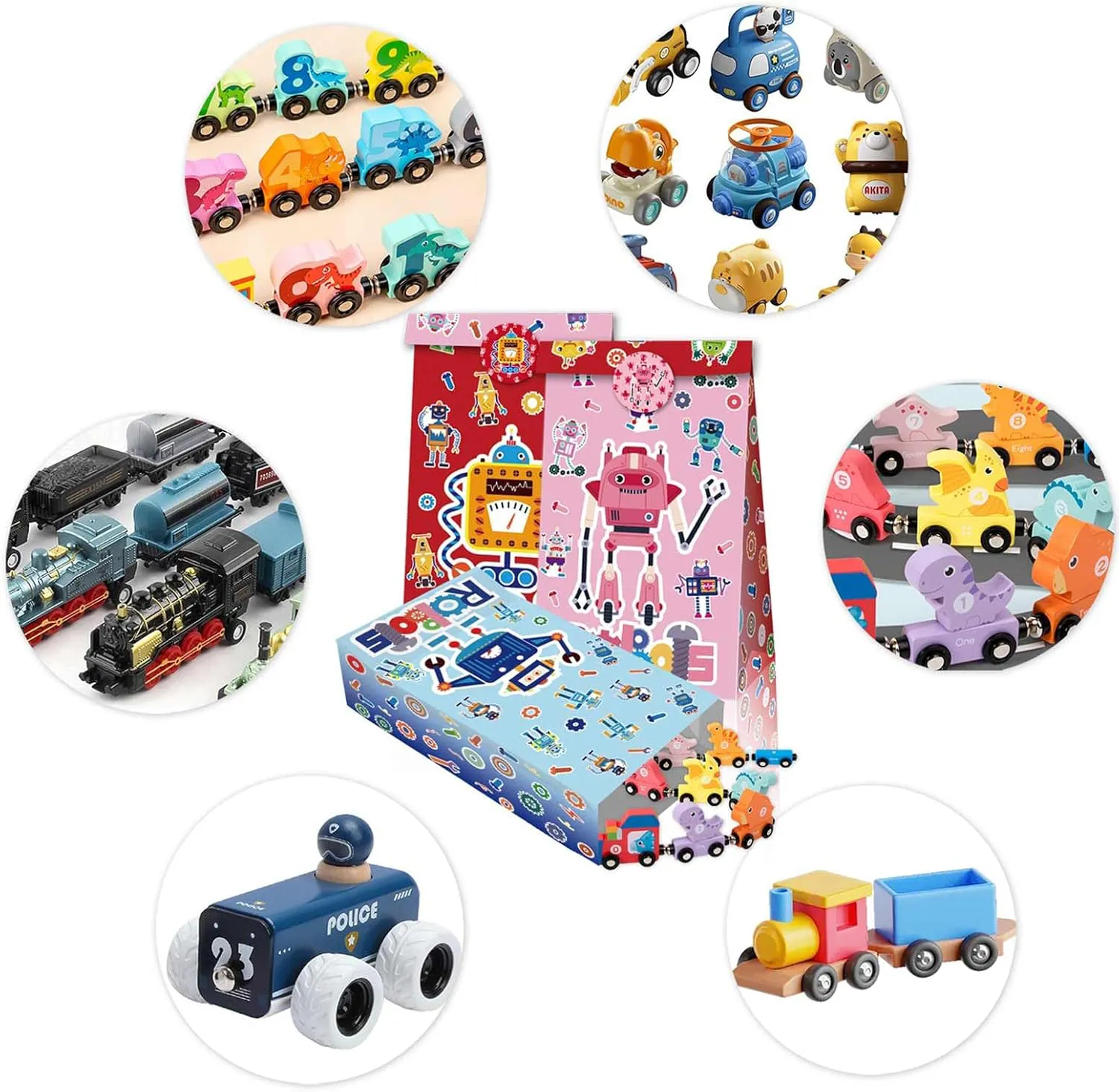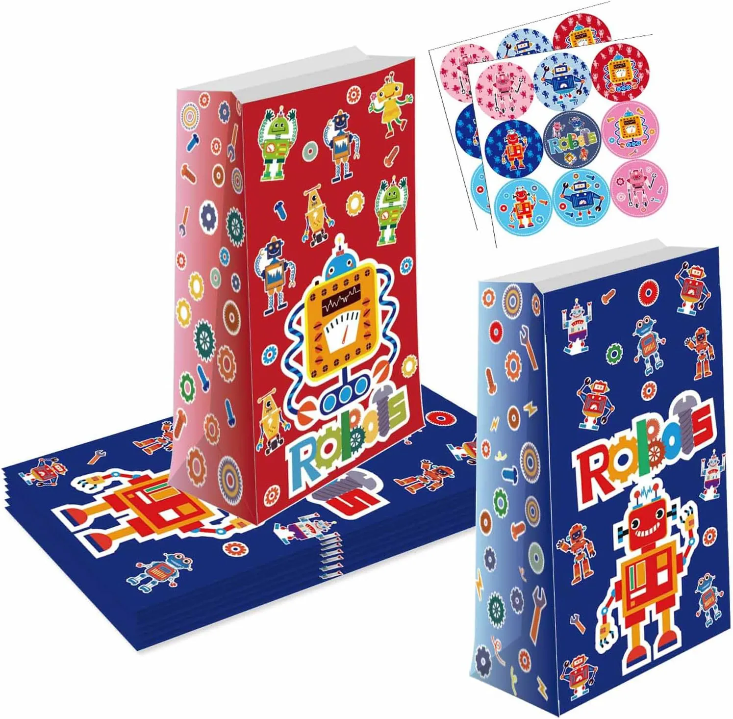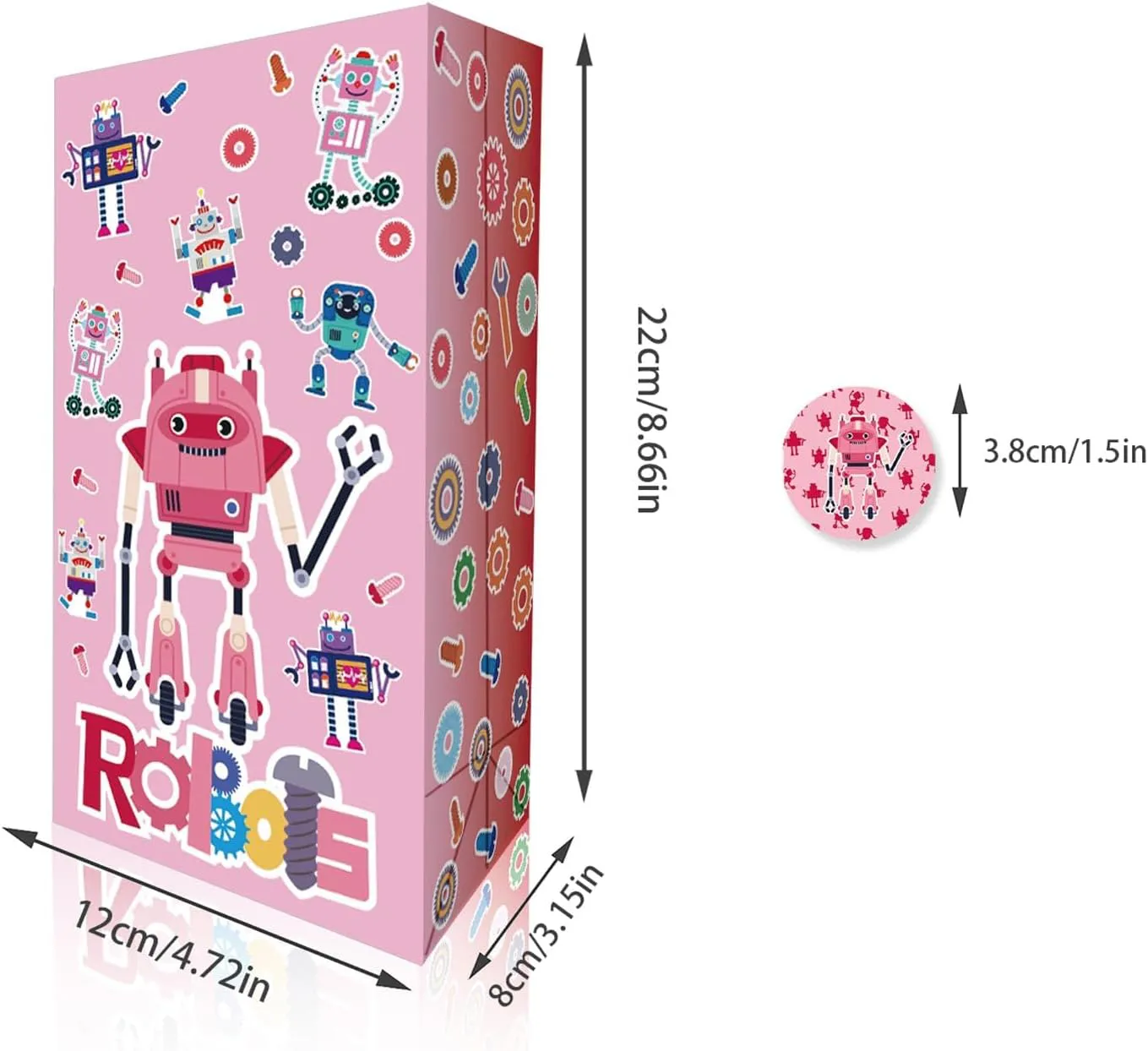 包装:获得充满乐趣的机器人图案礼品纸袋,包括12个牛皮纸袋和18个可爱贴纸。