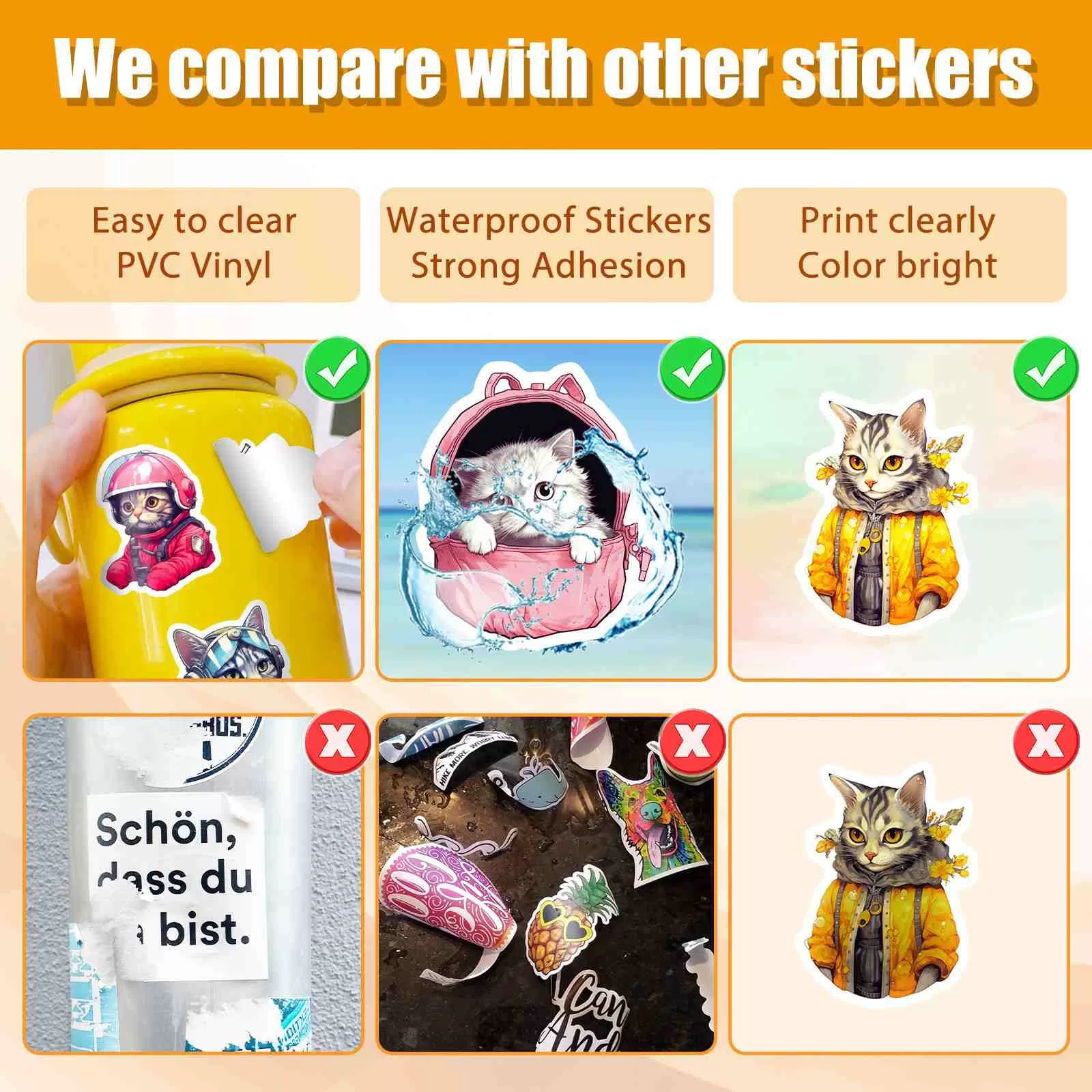 优质材料和耐用性:这些可爱的猫贴纸由防水乙烯基制成,表面哑光。它们抵抗水、划痕和紫外线褪色,确保您的装饰设计在笔记本电脑、水瓶和手机壳上持久耐用。